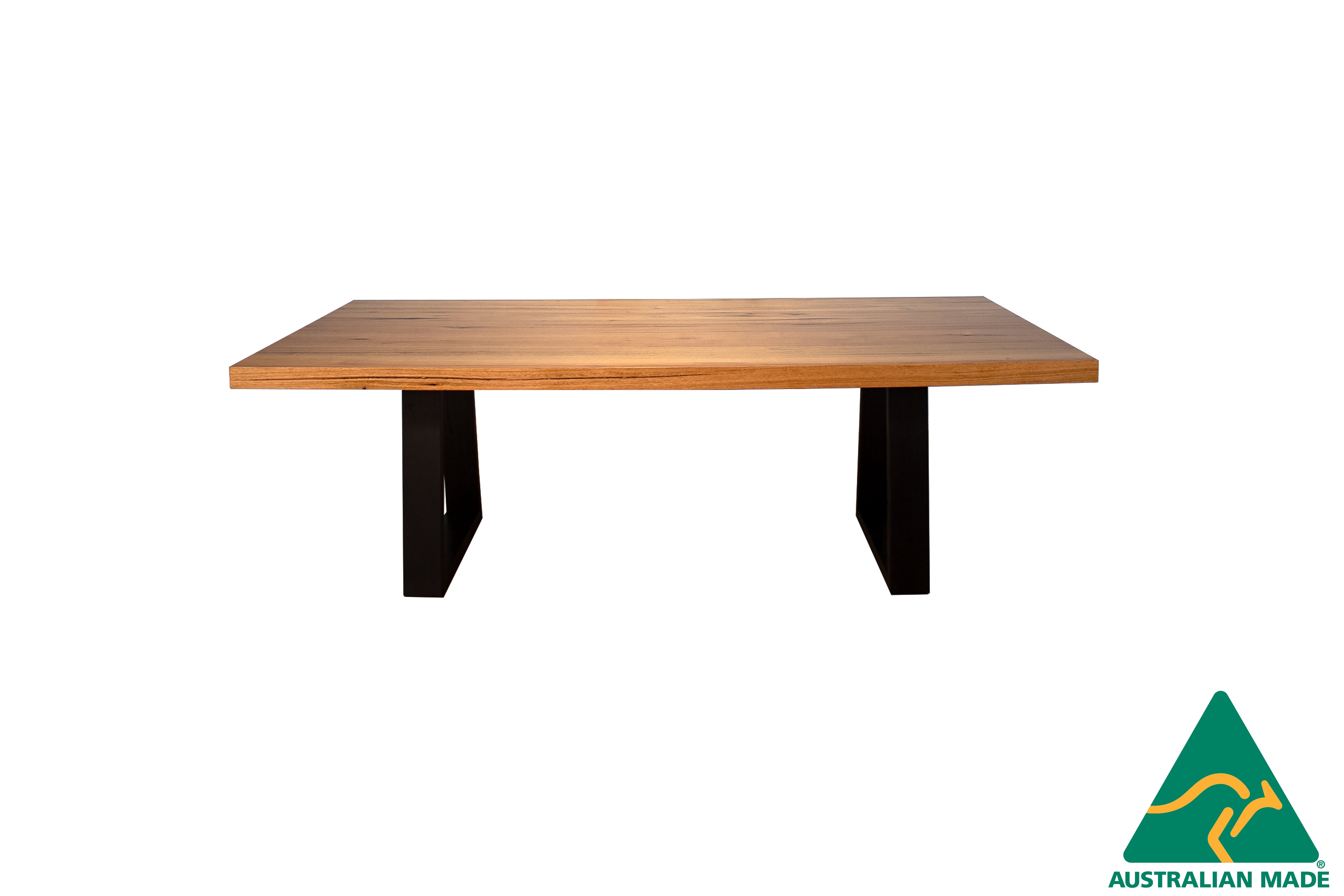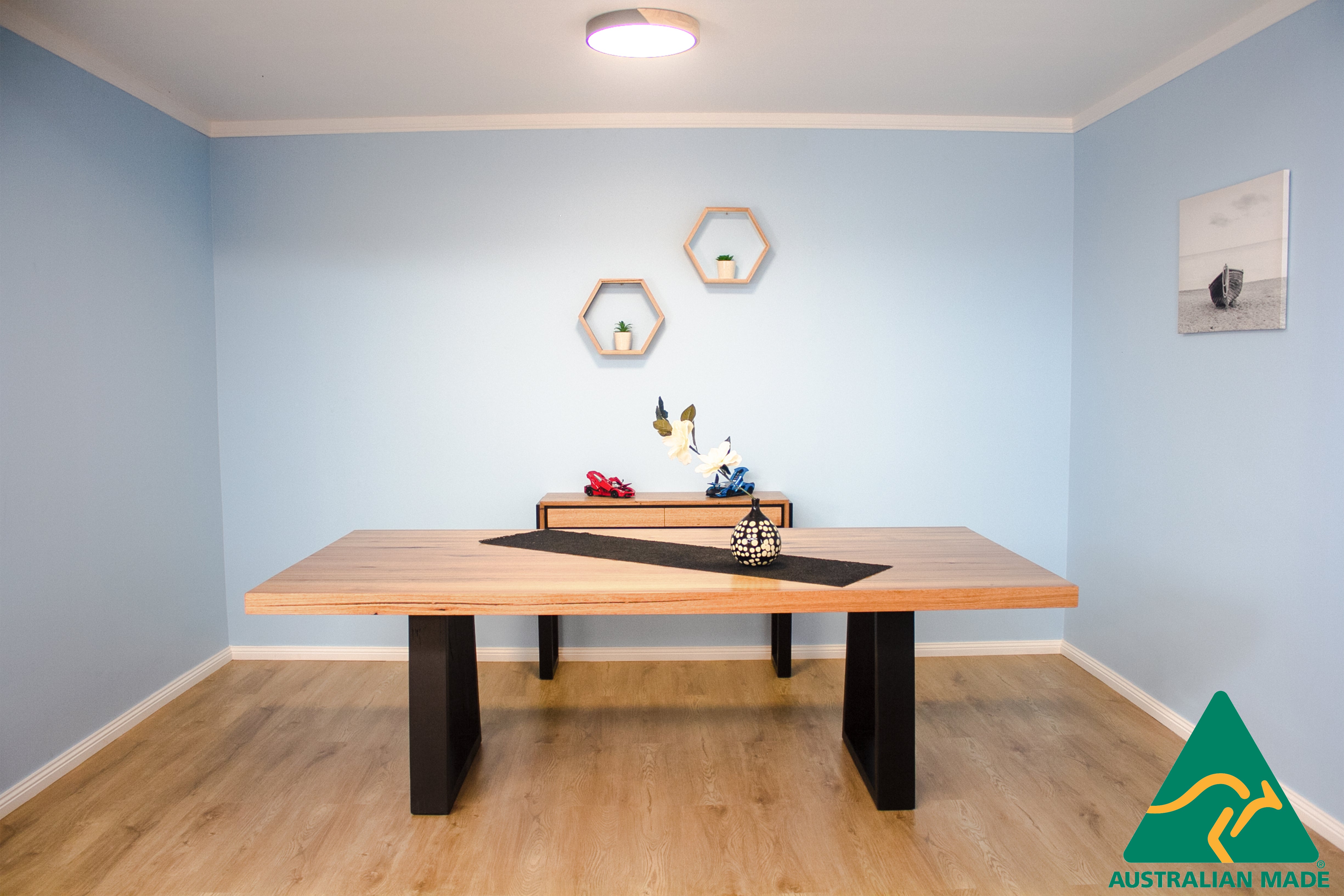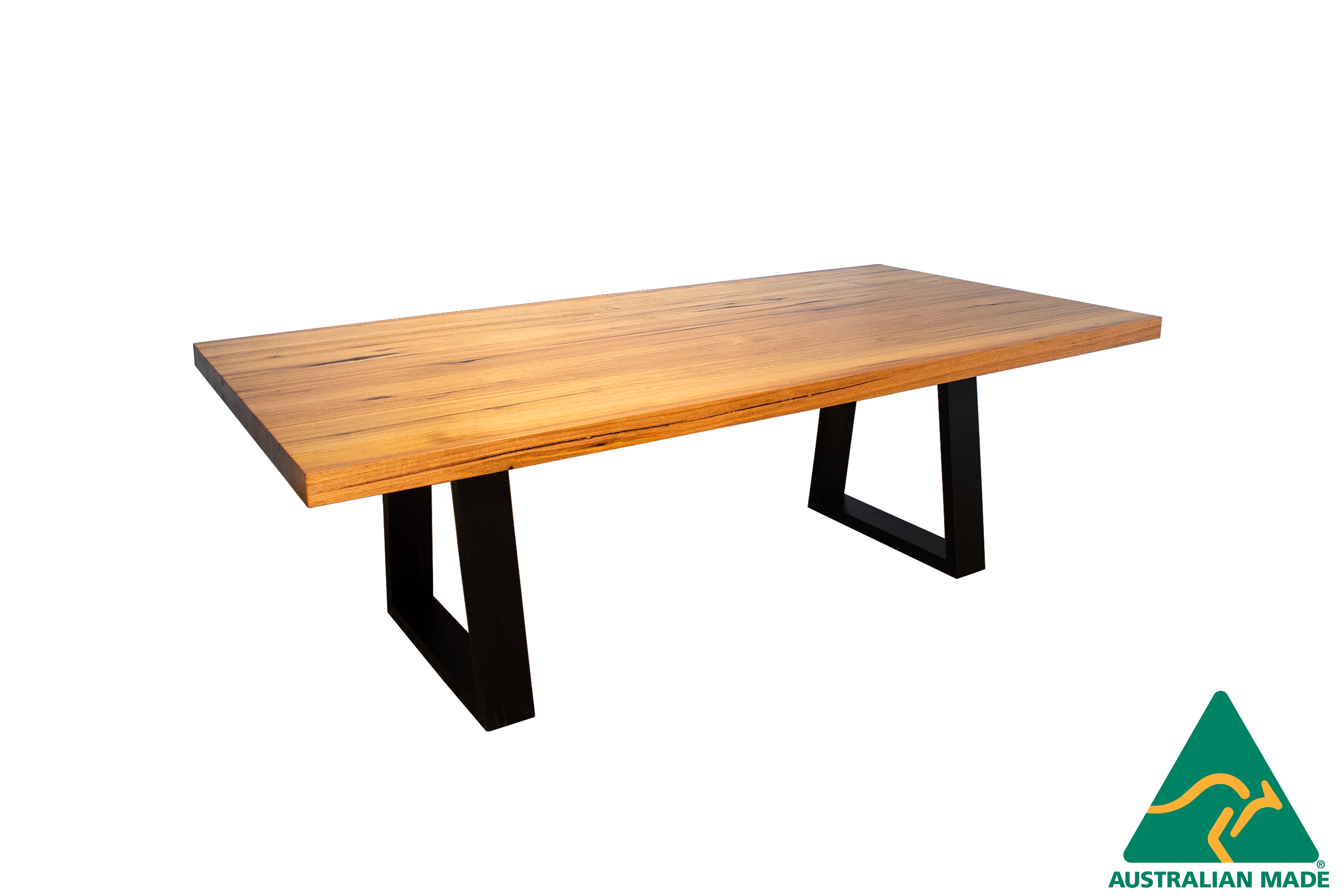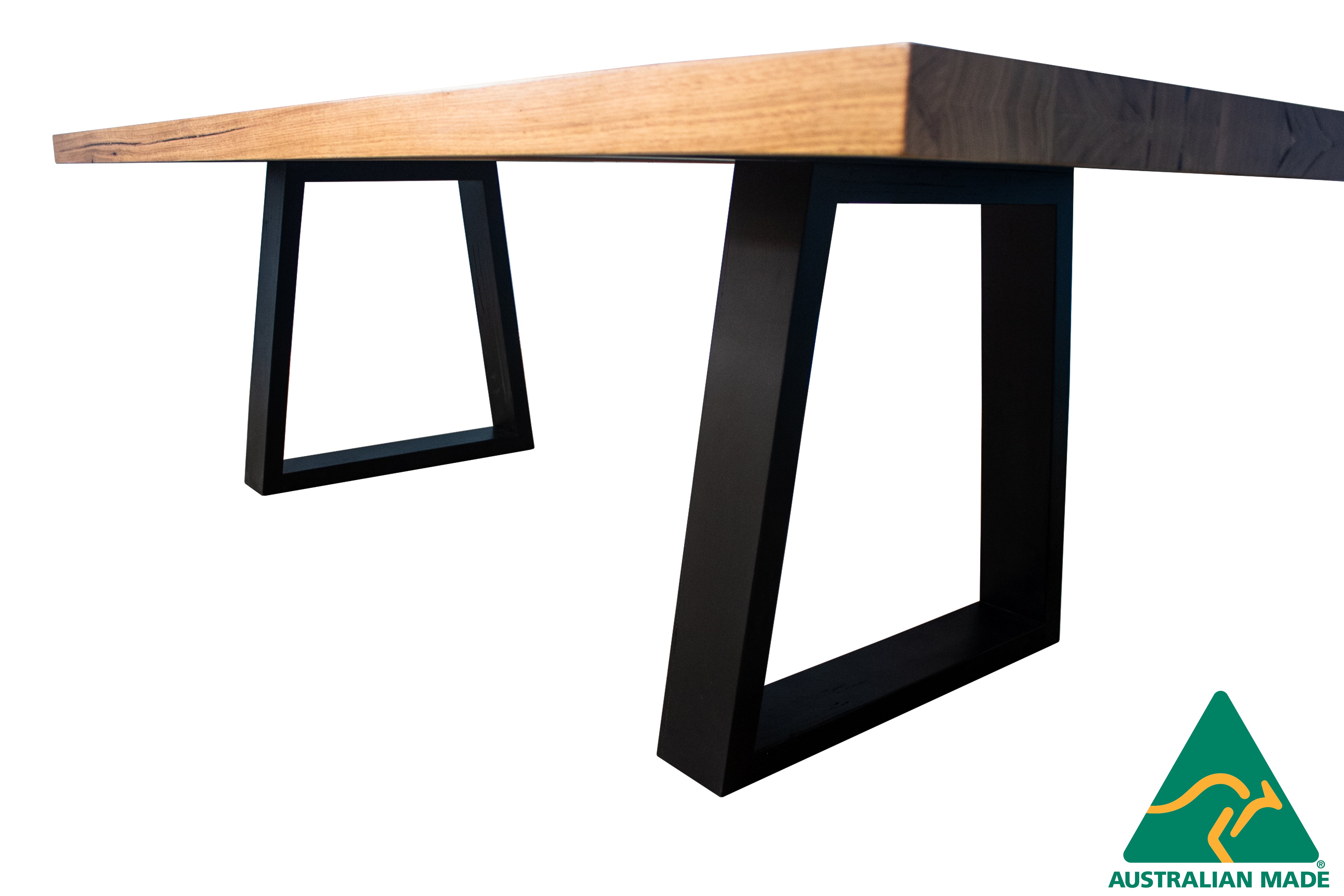 SOLID Messmate timber in double edge with black timber trapezium leg.